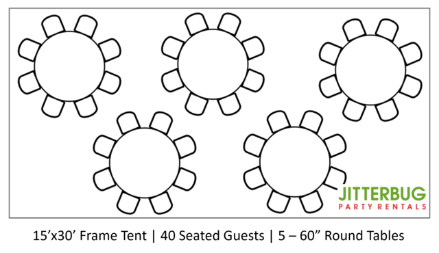 Jitterbug's 15x30 Tent Rental gives you 450 square feet of party area. This tent typically serves up to 48 seated guests and is a good option for intimate parties such as a ladies tea or smaller wedding or corporate event. See popular tent layouts for this 15x30 tent rental below. Setup and Teardown included in the price with stakes and ratchets for ground staking. (Concrete setup additional charges) 15x30 Tent Rental: 450 Square Feet | White 16oz Vinyl Top | 7 Ft Leg Height Dahlonega Tent Rentals | Wedding Tent Rentals | Tented Event Rentals
